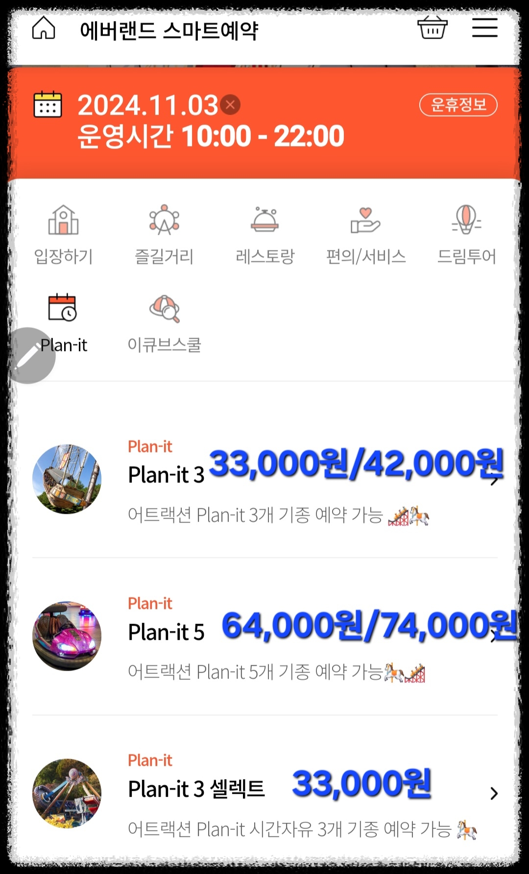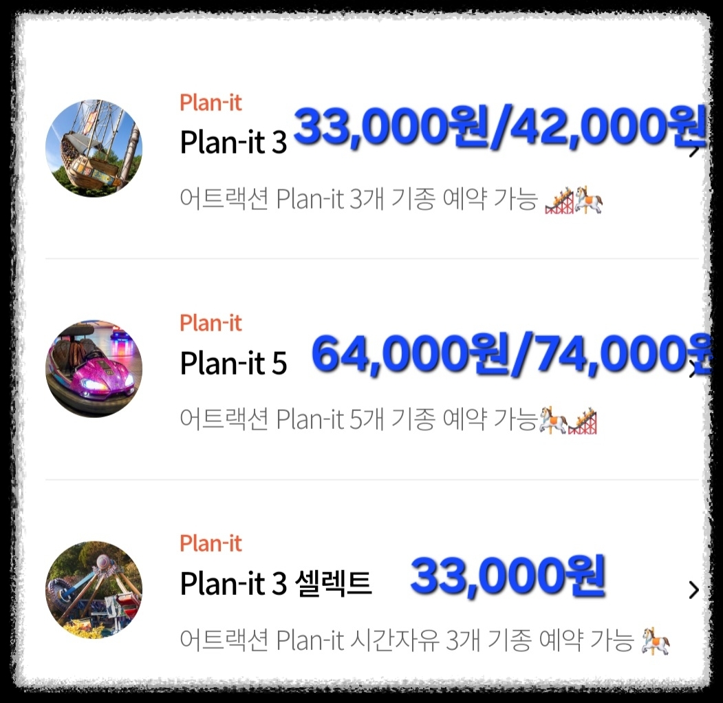 에버랜드 큐패스/플랜잇3 셀렉트 가격 : 33,000원. (추천안함. 시간지정 상품 이용불가)