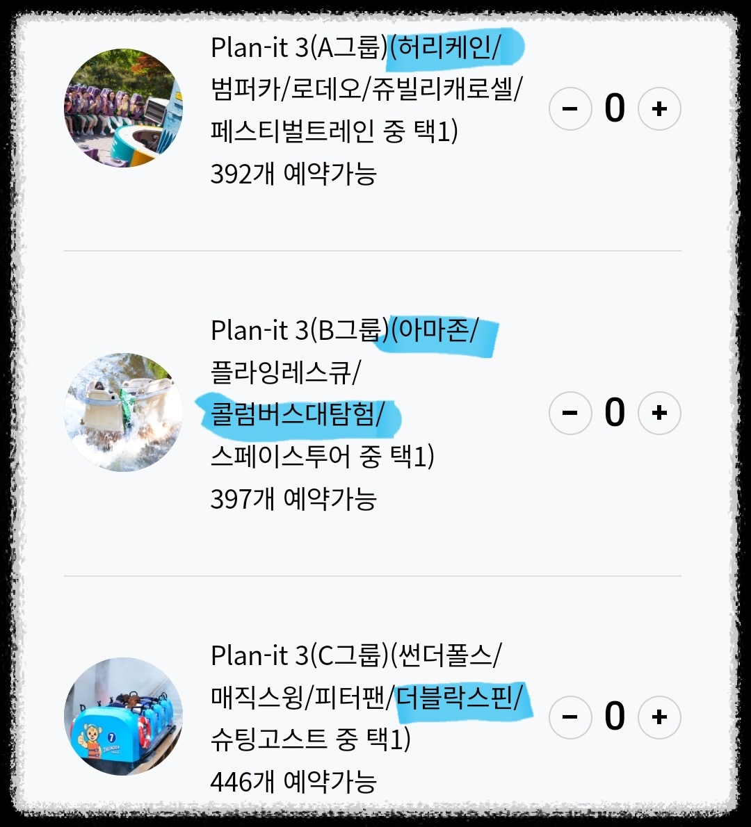 A, B, C그룹을 선택해 예약하고 그룹 내 어트랙션 중 하나씩 이용할 수 있다.