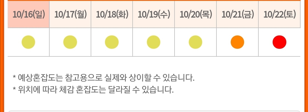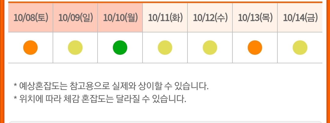 저번 주에 혼잡 예상도를 봤을 때는 10월 2일 혼잡도가 '다소 많음'이 아니었는데, 역시 정확하지 않나 봐요.